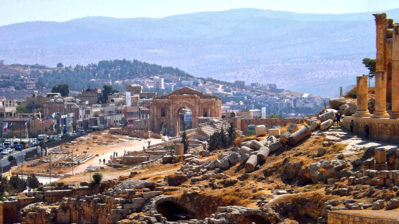 Blick über die Ruinen von Jarash auf Jordaniens Hauptstadt Amman